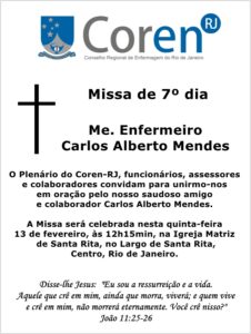Coren-RJ convida para missa de 7º dia do Me. Enfermeiro Carlos Mendes