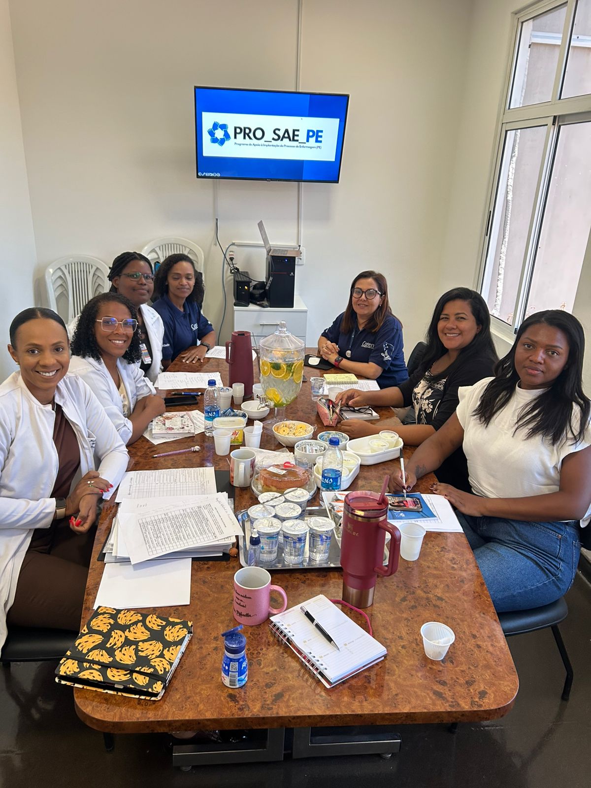 A agenda contemplou o Hospital Estadual Dr. Ricardo Cruz, em Nova Iguaçu, com a participação de Daiana Félix (NSP); Miriam Maria Ferreira Guedes e Jacqueline Santos (NEP); Kely Santos, gerente de Enfermagem; além da equipe diretiva da unidade, representada pela Diretora Geral Dra. Mikaella Batista, pelo Diretor Assistencial Dr. Antonio Silva Camara Jr. e pela Diretora Administrativa Adriana Nascimento delineando um processo de trabalho pautado em Teoria e Sistemas de classificação e registro consolidado com a 736/2024 personalizada com a missão institucional.