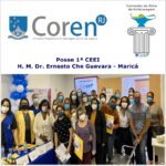 À tarde foi a vez do Hospital Municipal Dr. Ernesto Che Guevara receber o Coren-RJ para também empossar sua 1ª CEEI. O conselheiro prof. Edmar Jorge Feijó e a conselheira Fabiane Teixeira compuseram a mesa solene, além da colaboradora Rosimere Silva e da enfermeira fiscal do Departamento de Ética, Maria Auxiliadora Rodrigues. Participaram da cerimônia, o diretor -geral médico, Marcos Victoriano; a diretora de enfermagem, enfa. Ana Paula dos Santos Silva; a gerente de enfermagem e secretária da Comissão Eleitoral, enfa. Carla Moraes Lins; a coordenadora do CTI e presidente da Comissão Eleitoral, enfa. Alana Priscilla da Silva Viana; a coordenadora do Centro Cirúrgico e CME e membro da Comissão Eleitoral, enfa. Elizângela Oliveira Ferreira Bragança; e o coordenador de Educação Continuada, enf. Rodrigo França Mota.